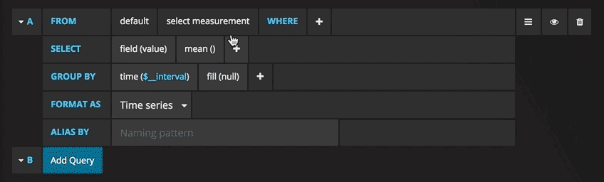 Du kannst Regex Muster für Metriknamen oder Tagfilterwerte eingeben. Achte dabei darauf, dass Regex Muster in Schrägstriche einzuhüllen(/). Grafana passt die Tagbedingungen dann automatisch an, um den InfluxDB Übereinstimmungsoperator(= ~) zu verwenden.